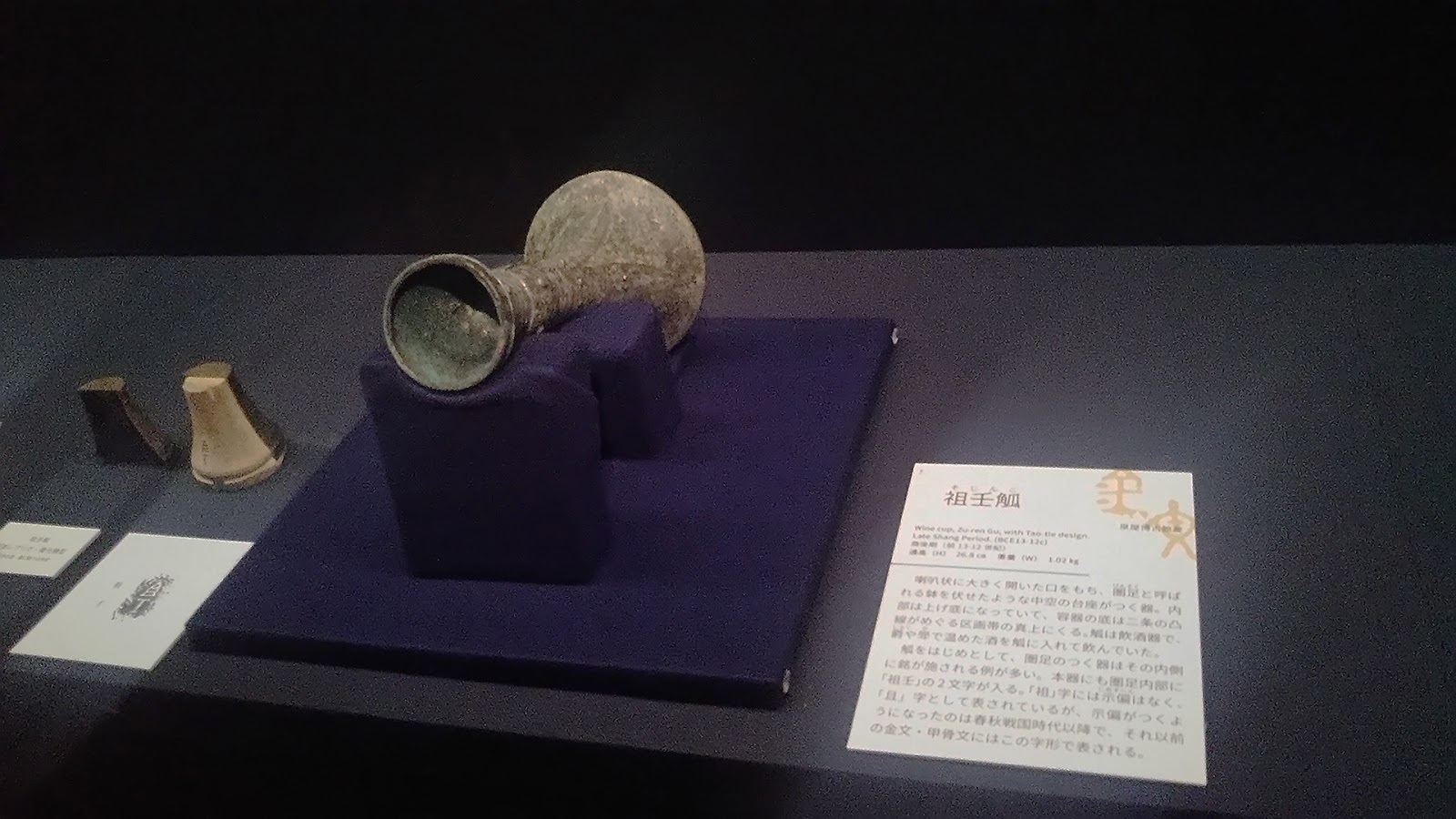 青銅器は銘文が見やすいように陳列されている。これはなかなかない。一般的な青銅器展などでは普通に器の頭部を上に向けているので銘文が見えなかったりするのだが、この金文展ではそういうことはない。(とはいえ鋬内部の銘文はさすがに見づらい)